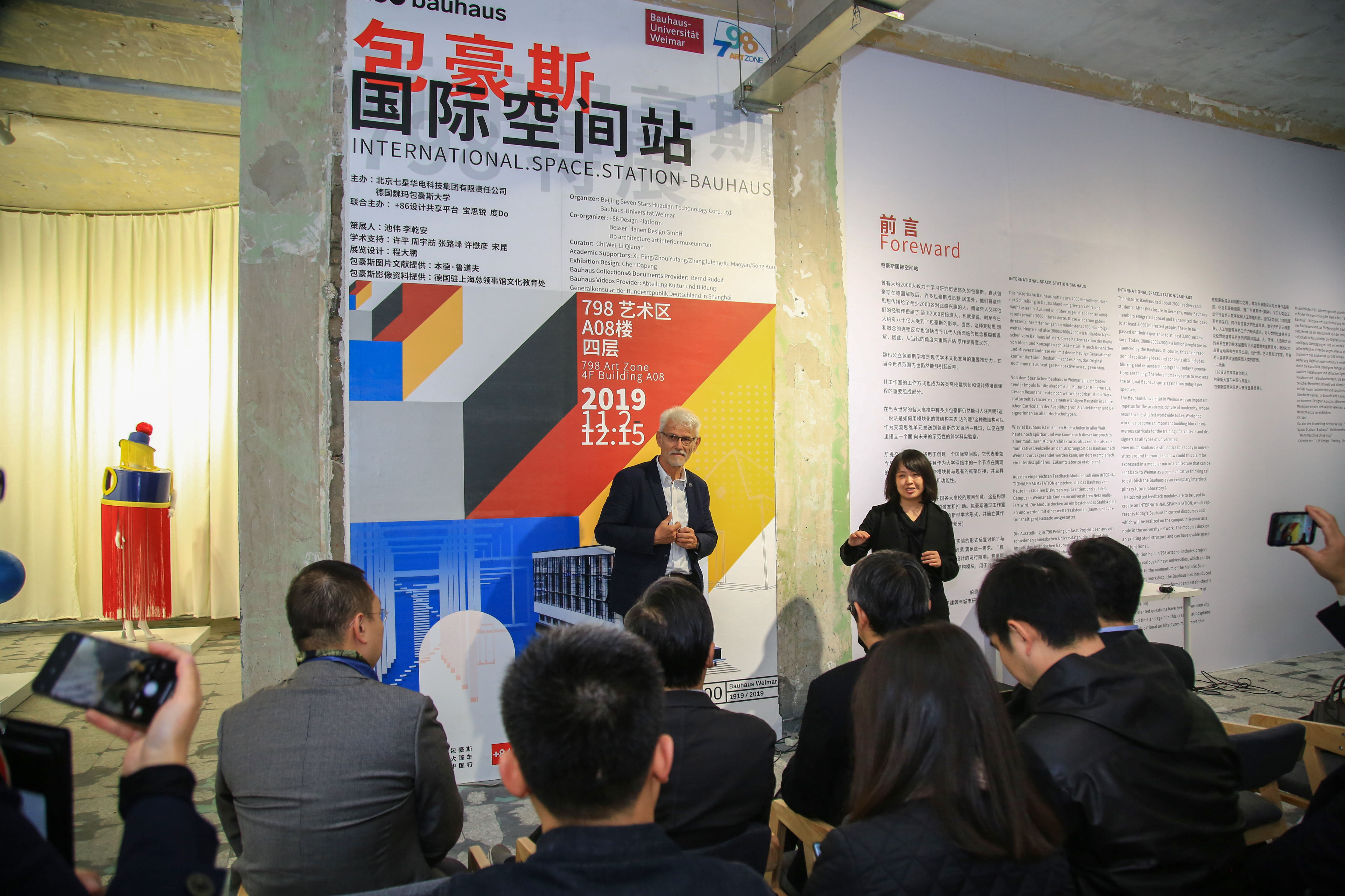 北京七星华电科技集团总裁,北京798文化艺术区董事长王彦伶先生与魏玛包豪斯⼤学建筑与城市研究学院院⻓、德国院长会议协会主席Bernd Rudolf本德·鲁道夫教授共同祝贺这场百年包豪斯主题展览顺利举办并就798BAUHAUS (798包豪斯)交换展举行签约仪式。据悉该交换展将于2020年在德国展示推广中国当代文化及艺术设计。